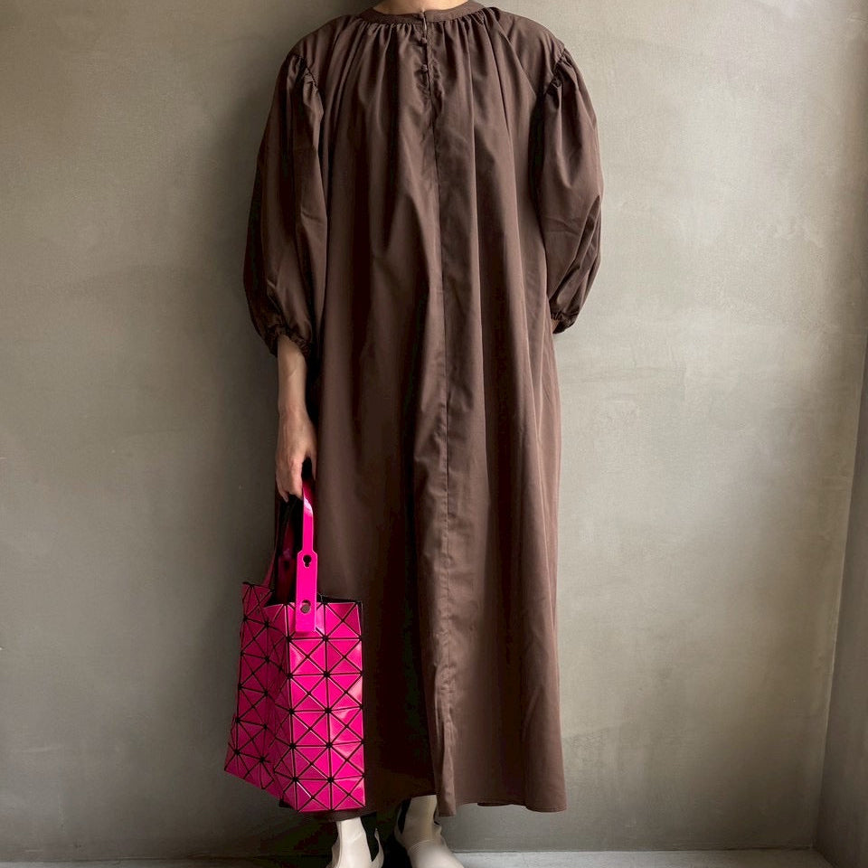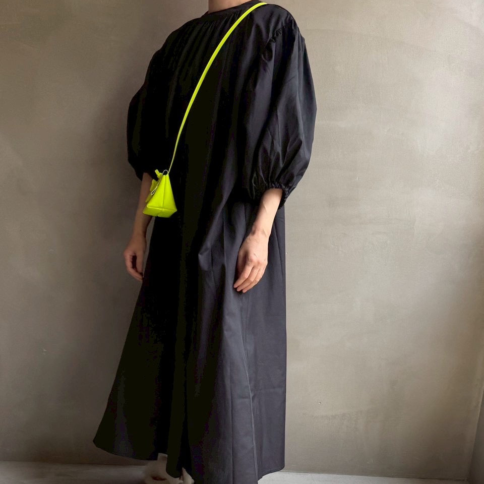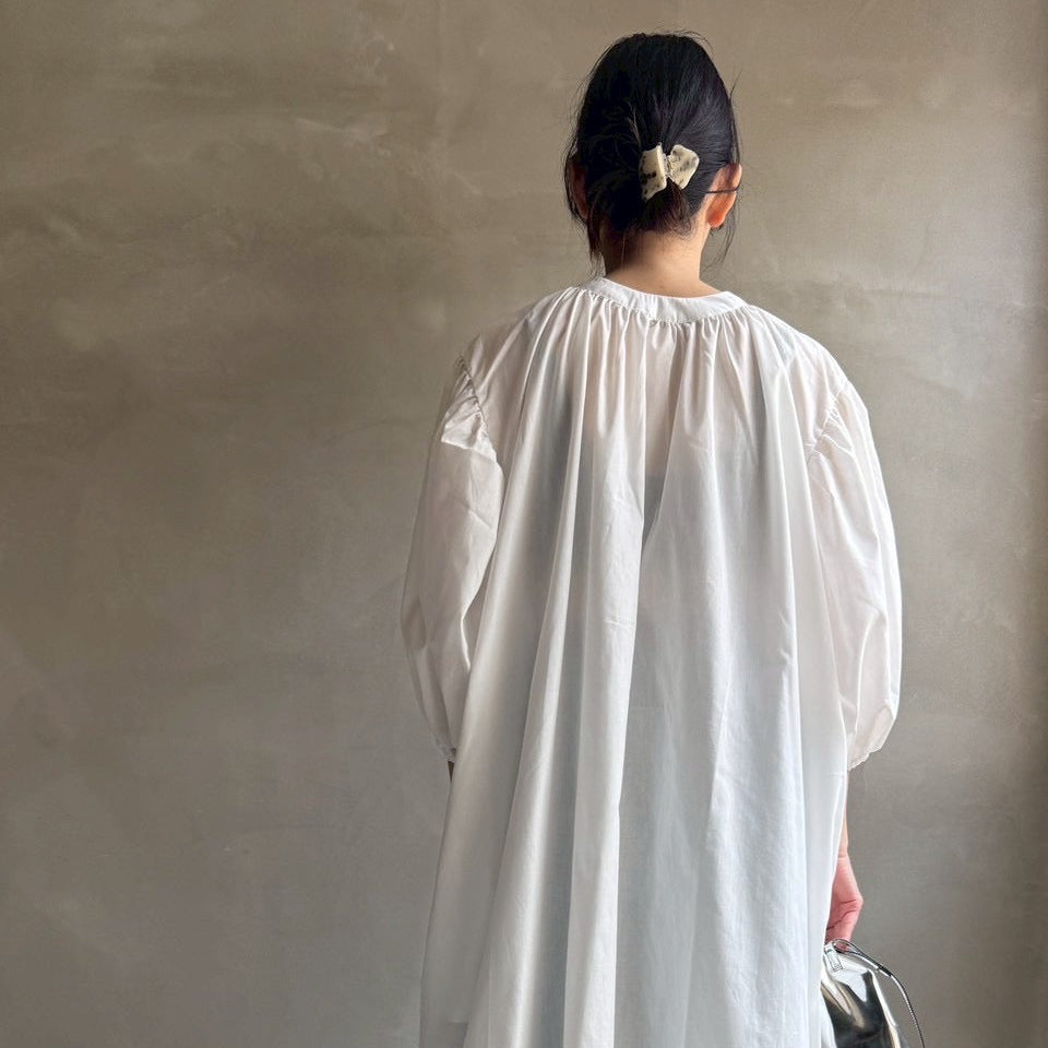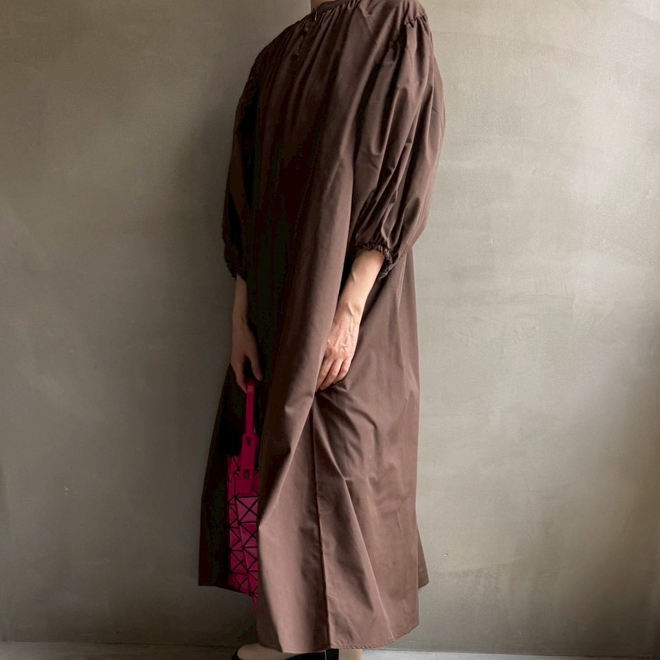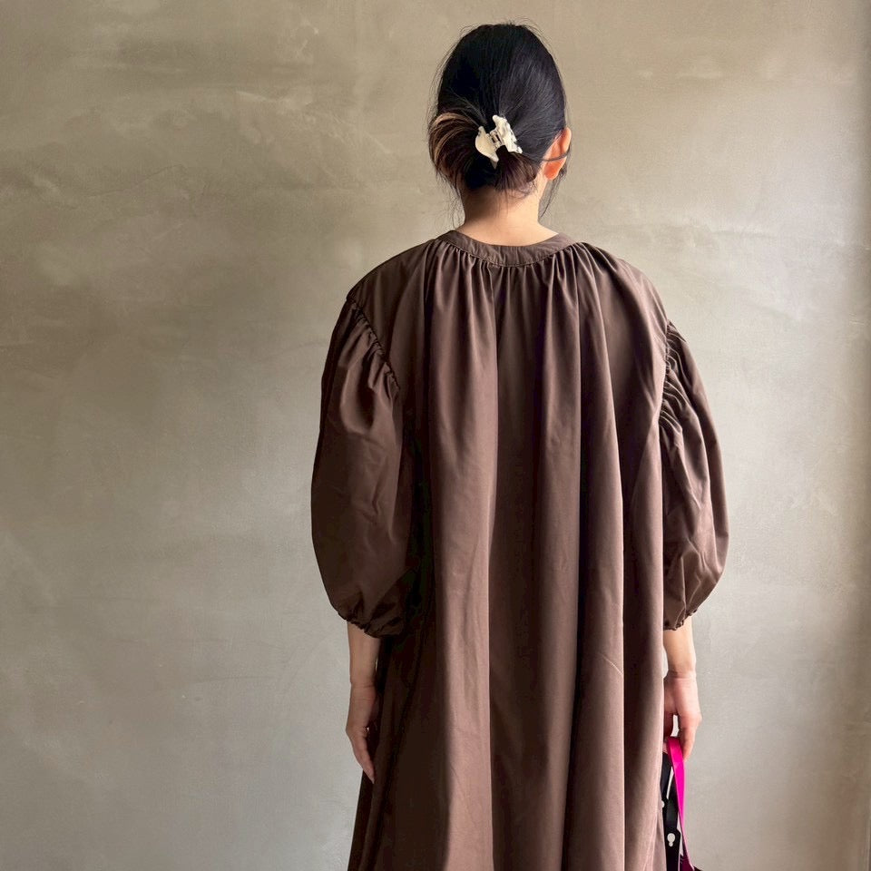 ゆったりリラクシーなワンピース首元にギャザーを寄せて
