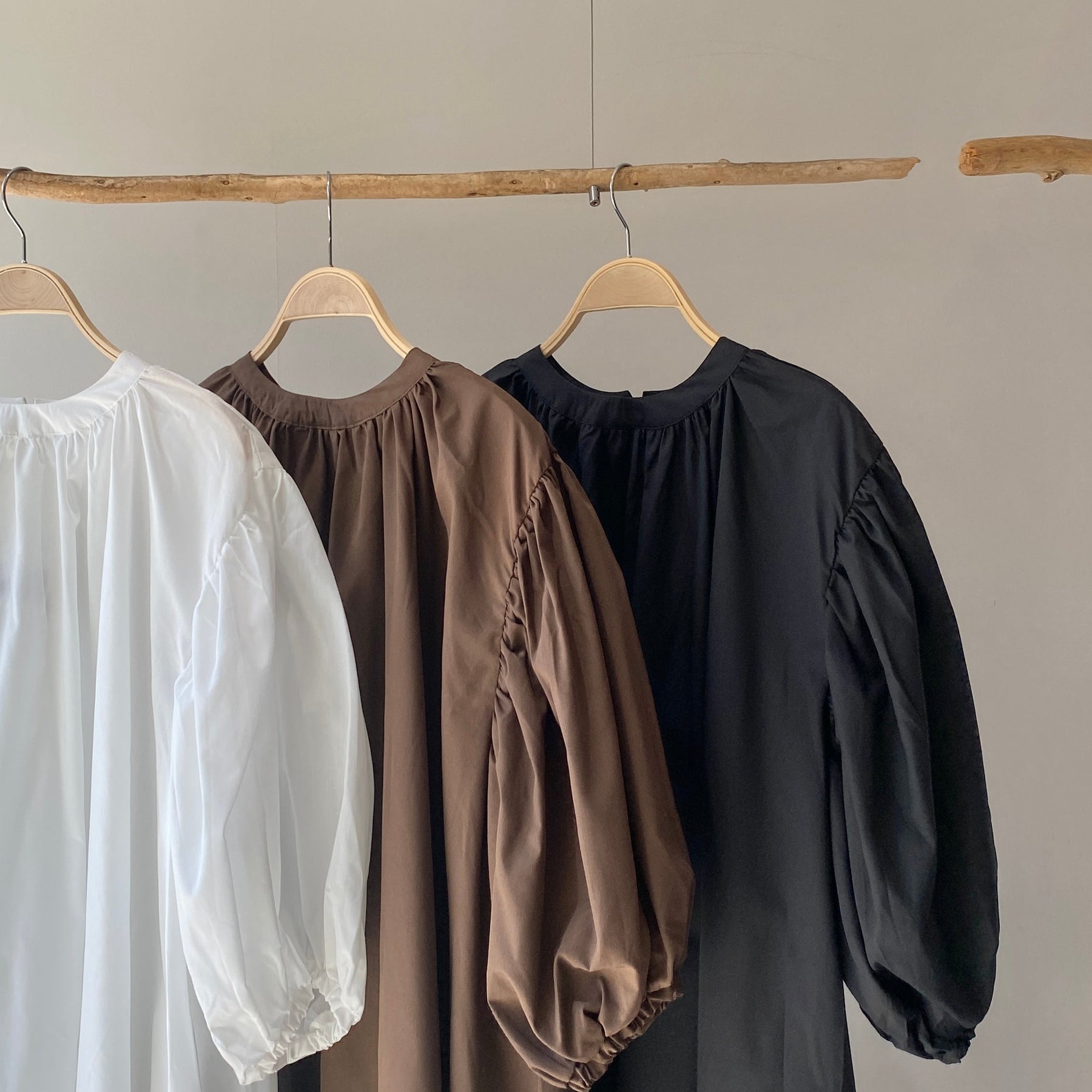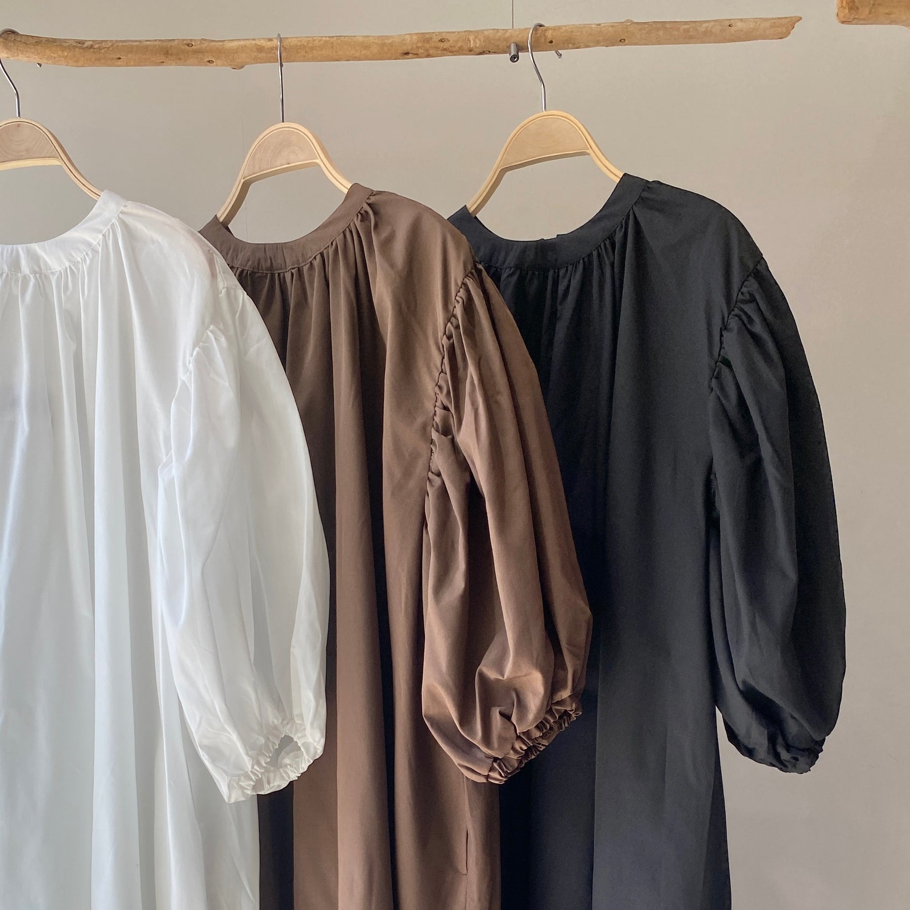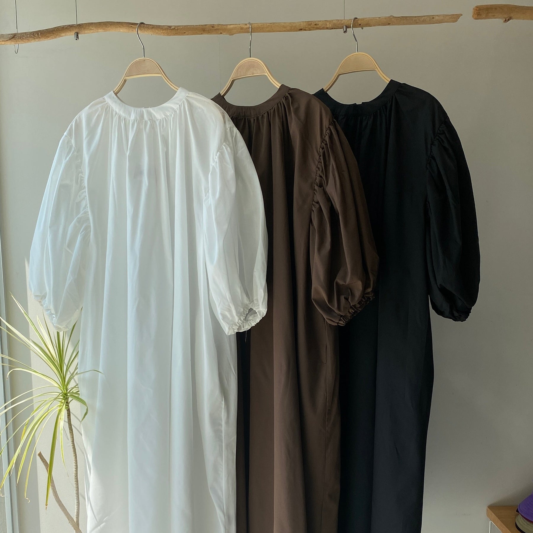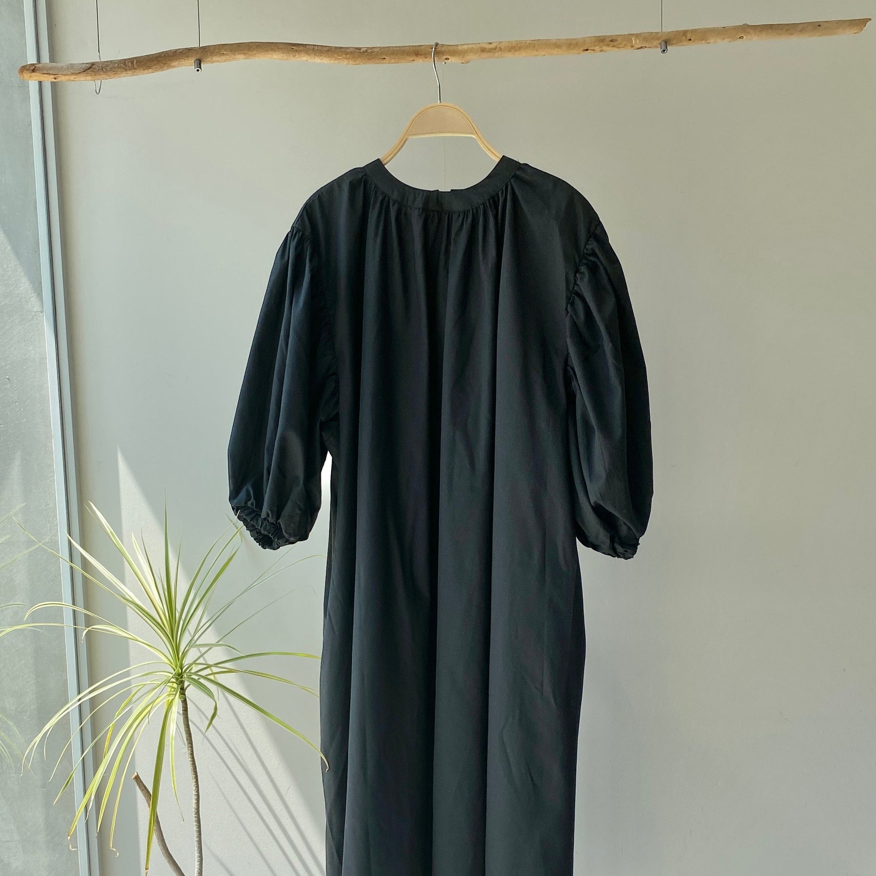 ゆったりリラクシーなワンピース首元にギャザーを寄せて
