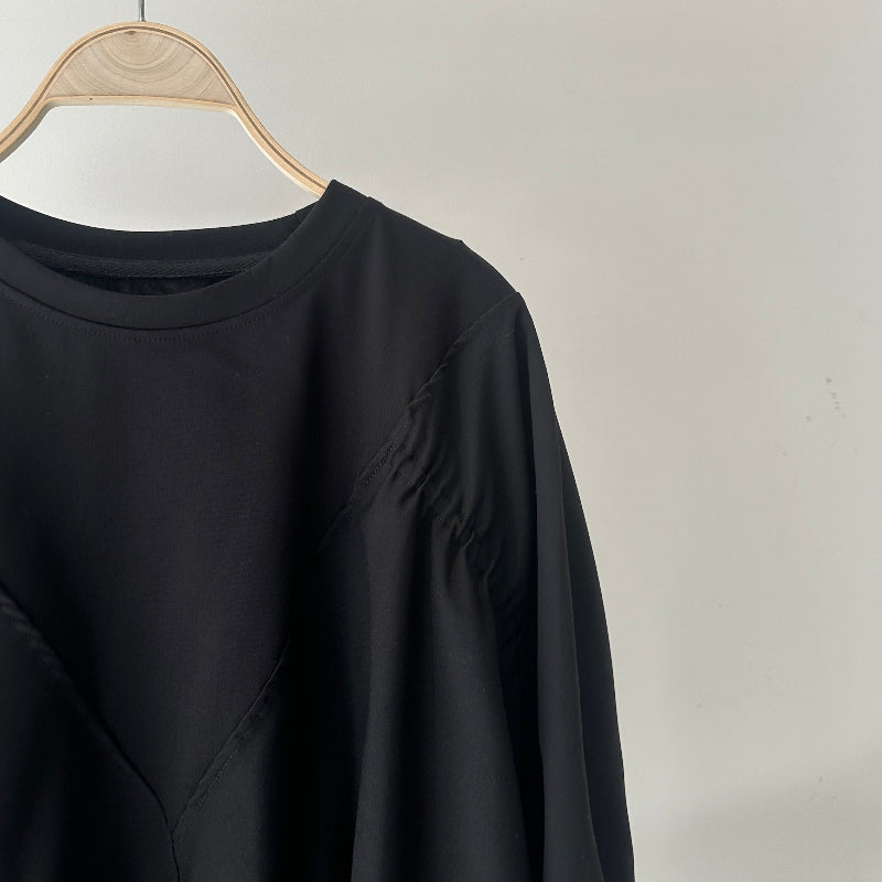 身頃は伸縮性のあるストレッチ素材、裾は布帛素材で切り替えた異素材デザイン