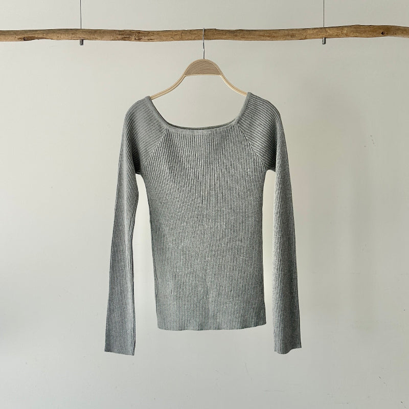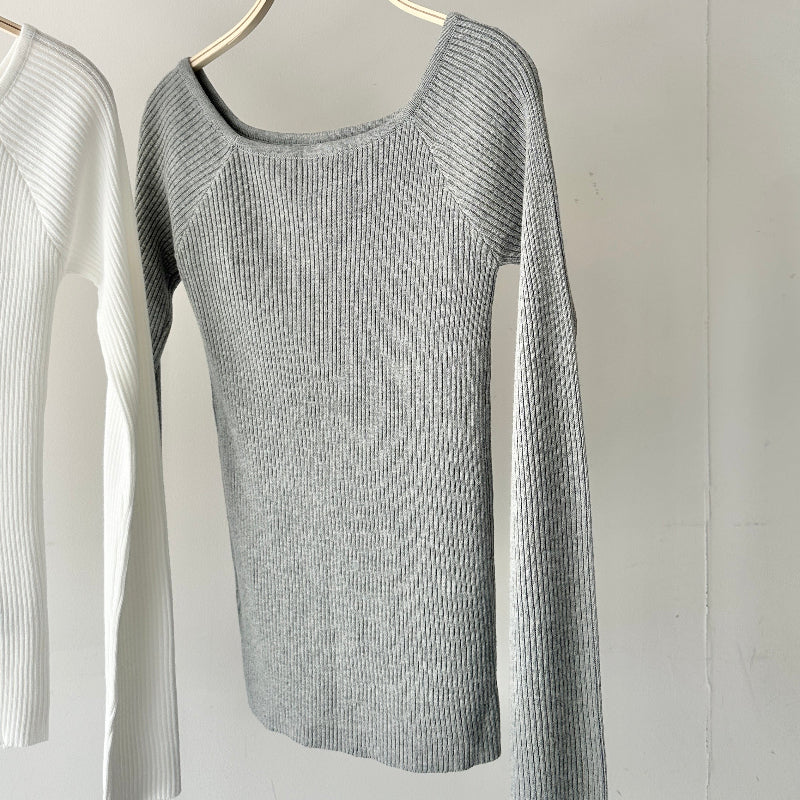 デコルテを美しく引き立てるスクエアネックが魅力の上品ニット。