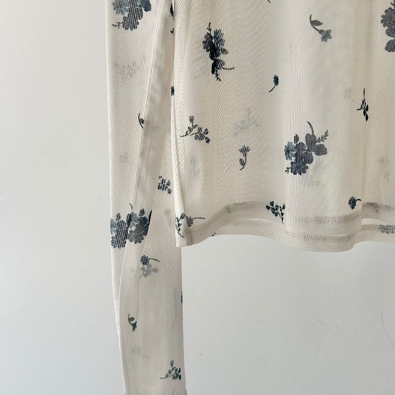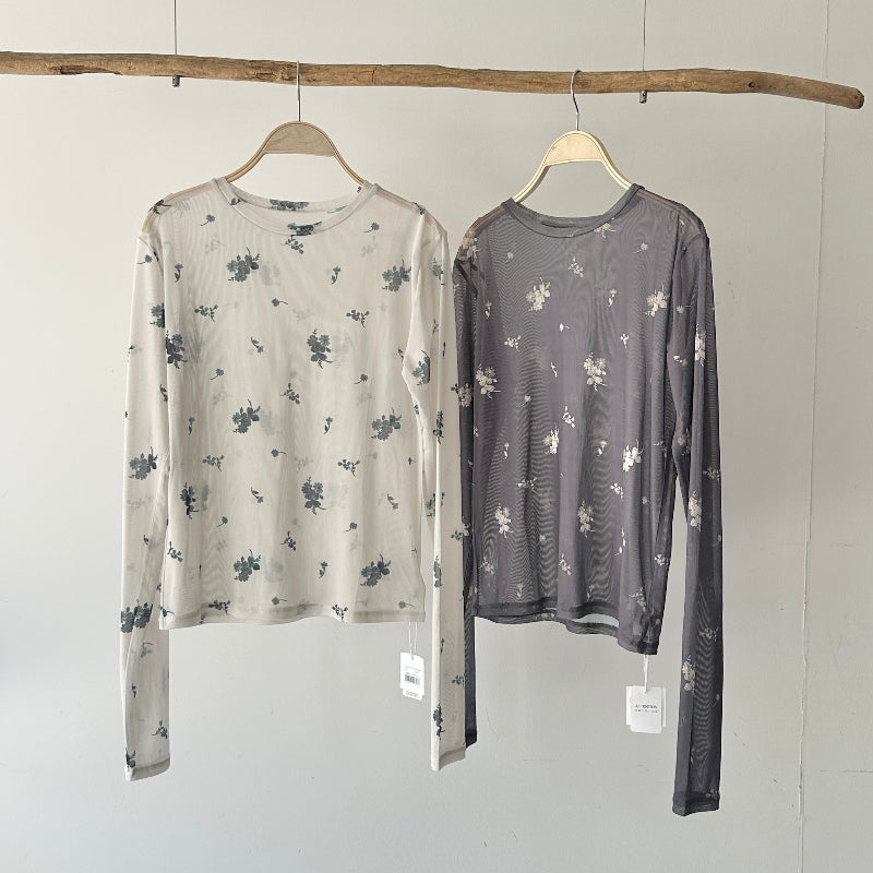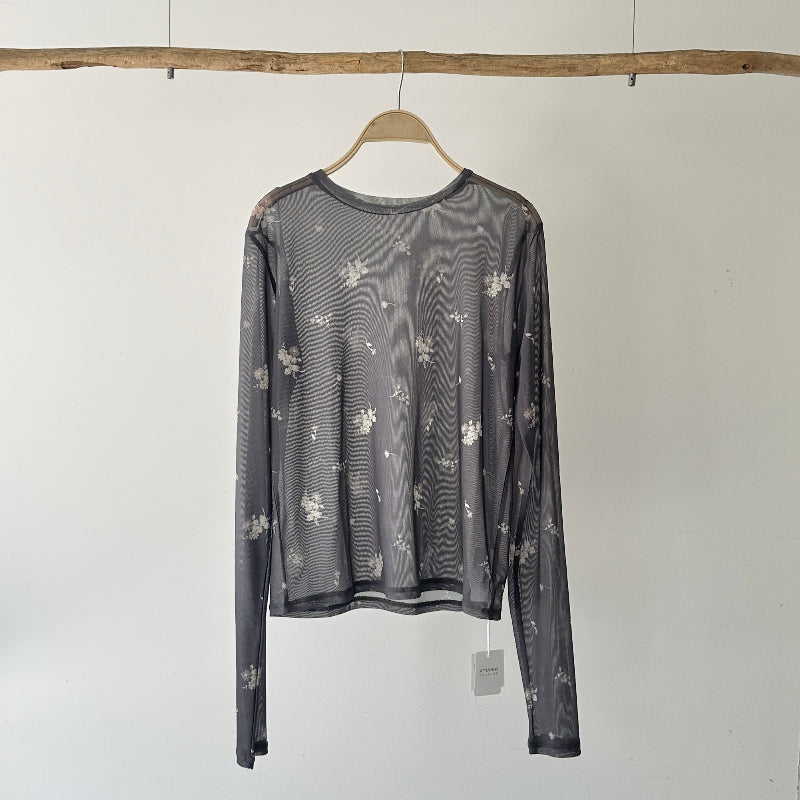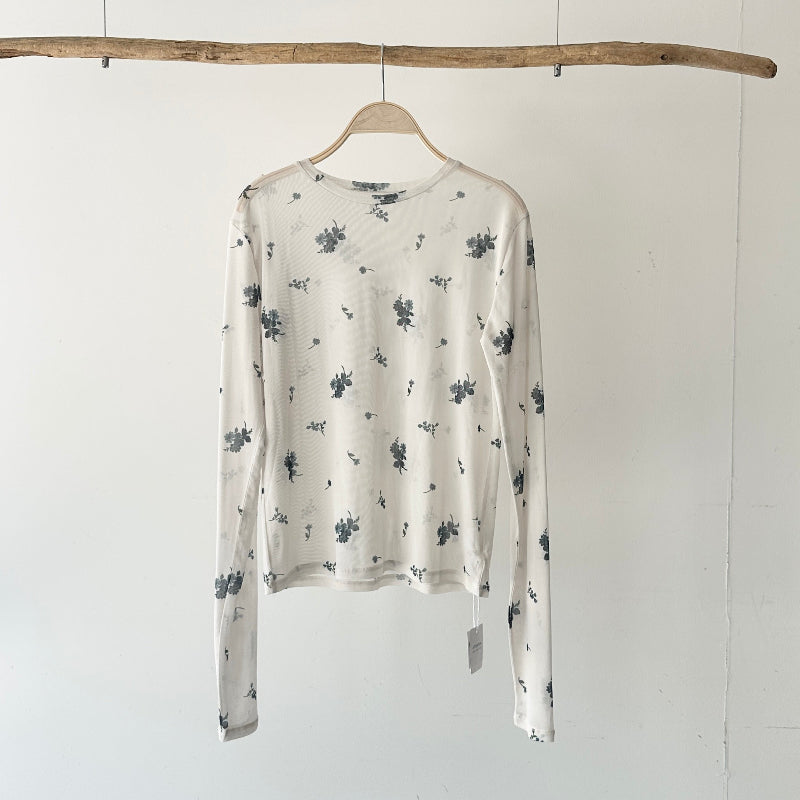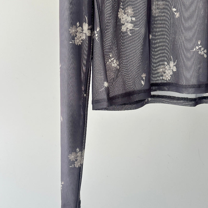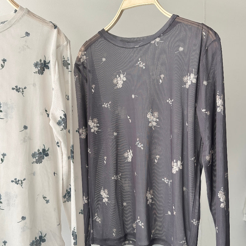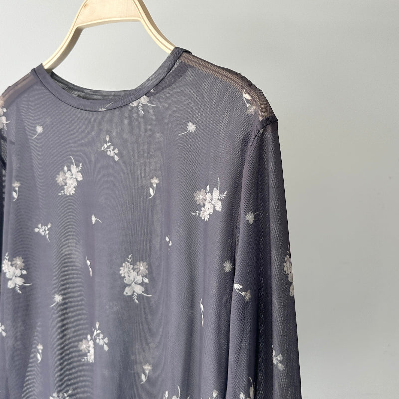 繊細な小花柄をあしらったシアー素材が、女性らしさを引き立てる一枚。