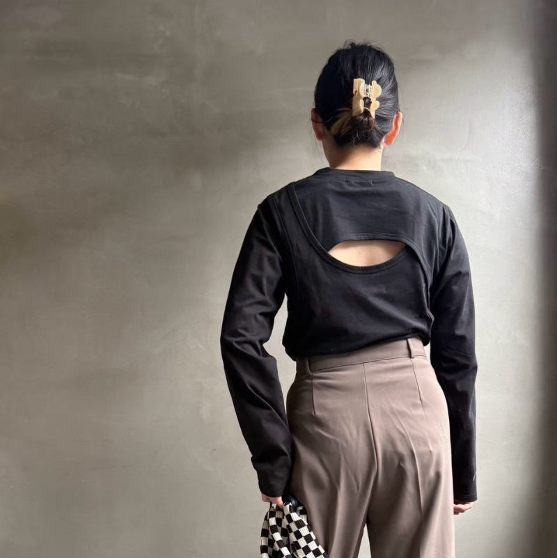 - 【ハモミシノオトナフク】Back cutout design long t-shirt