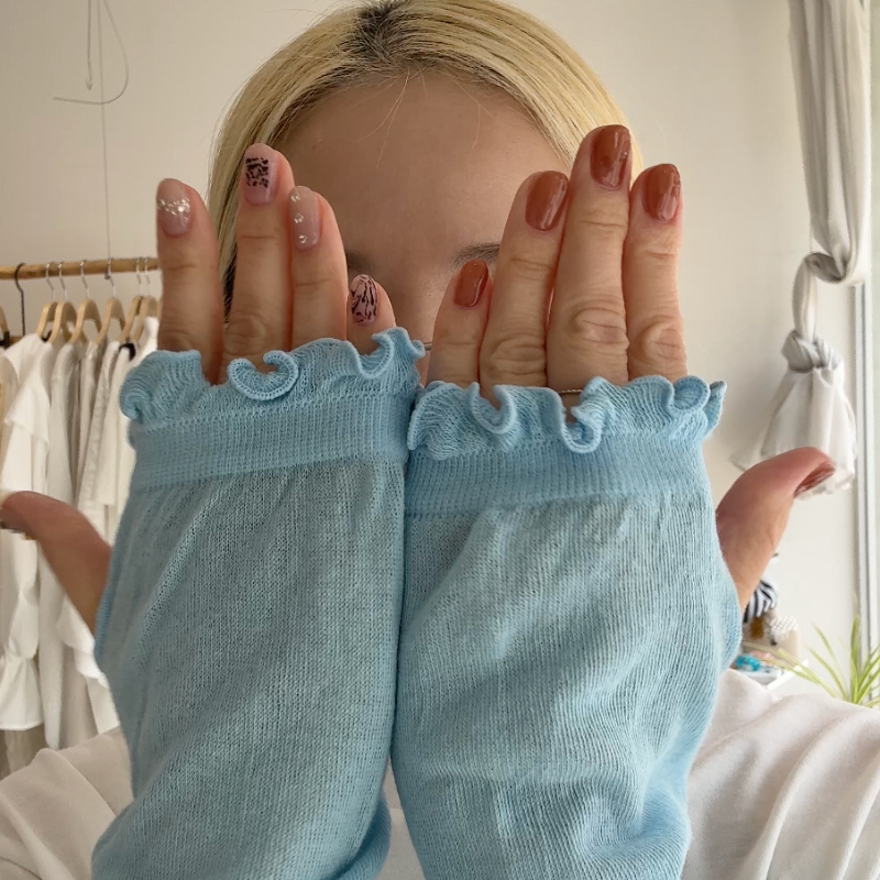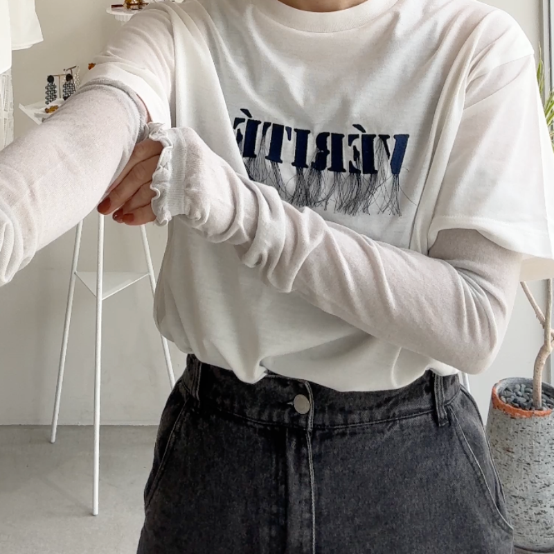 二の腕までカバーできる長め設計&くしゅっとアレンジもOK。