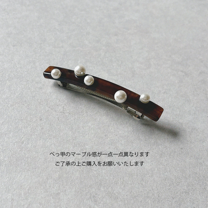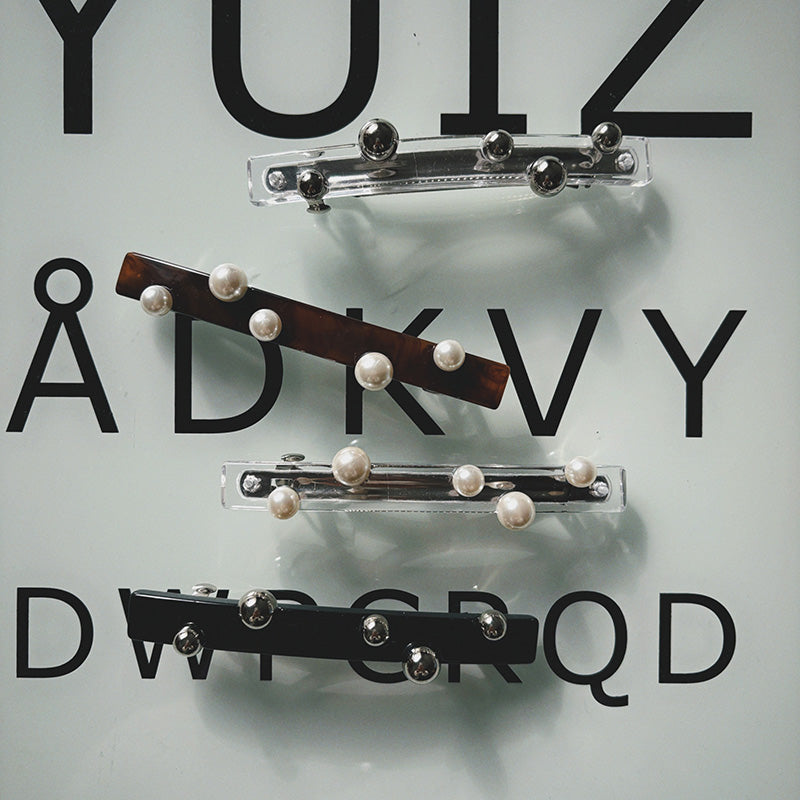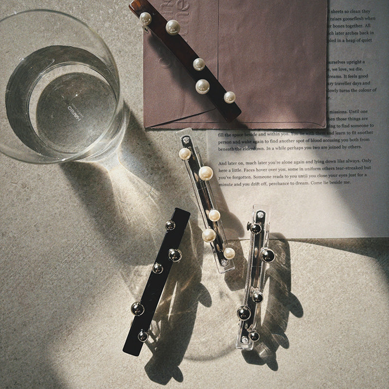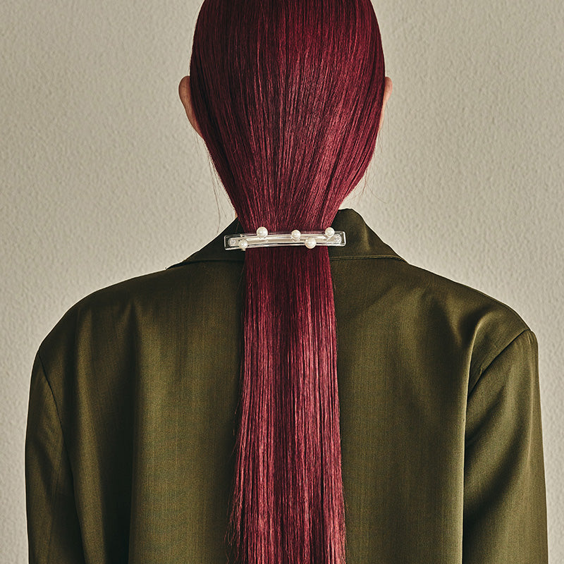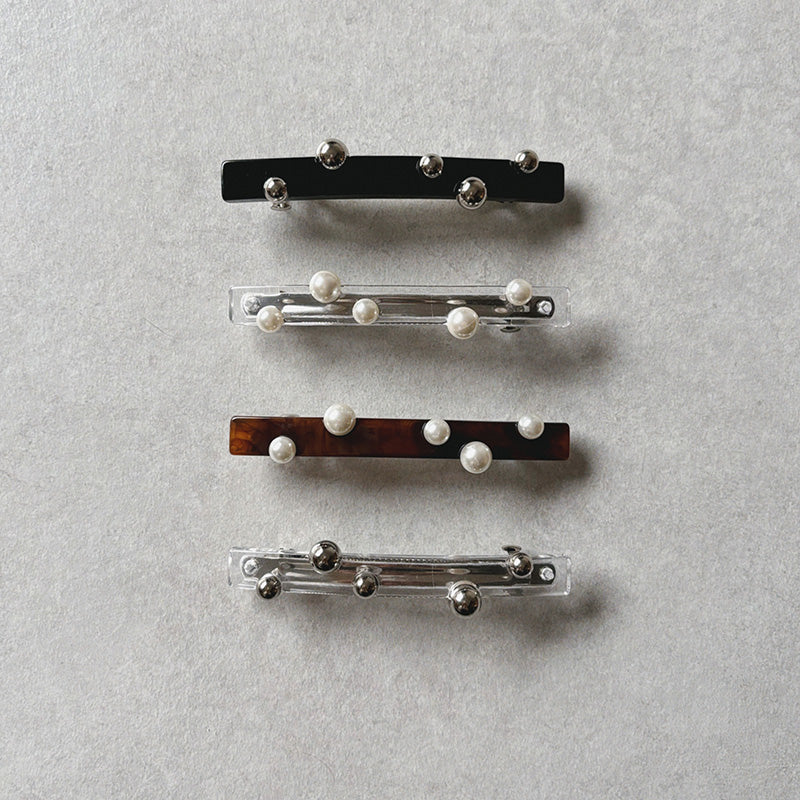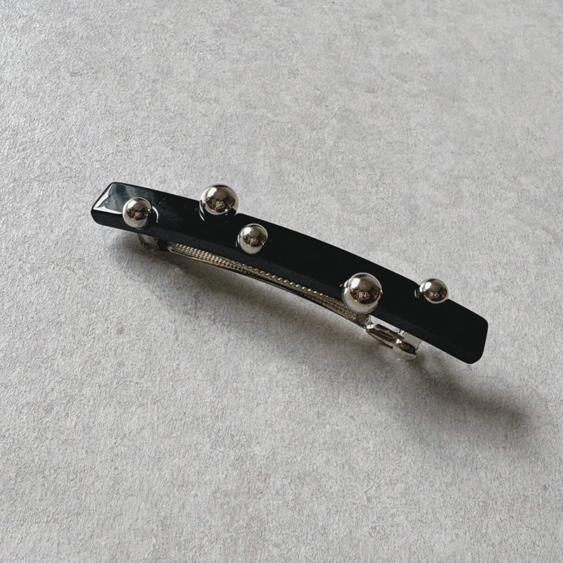 ポニーテールが一気に洗練される直線的なフォルムにランダムに配されたパールやメタルボール。