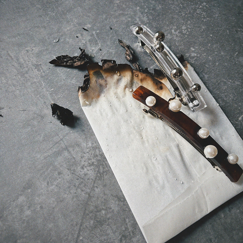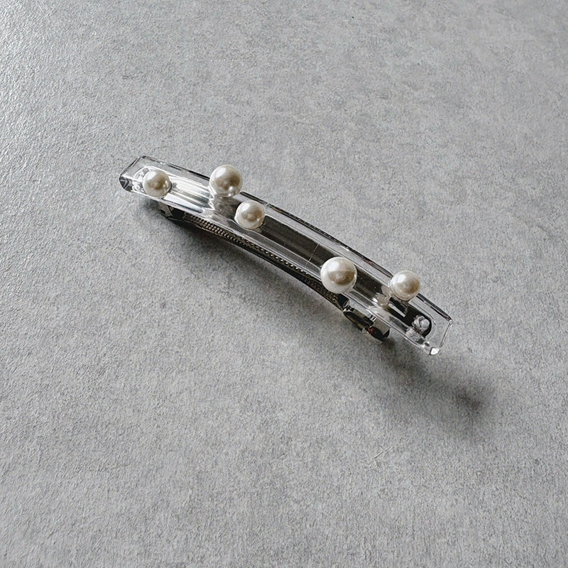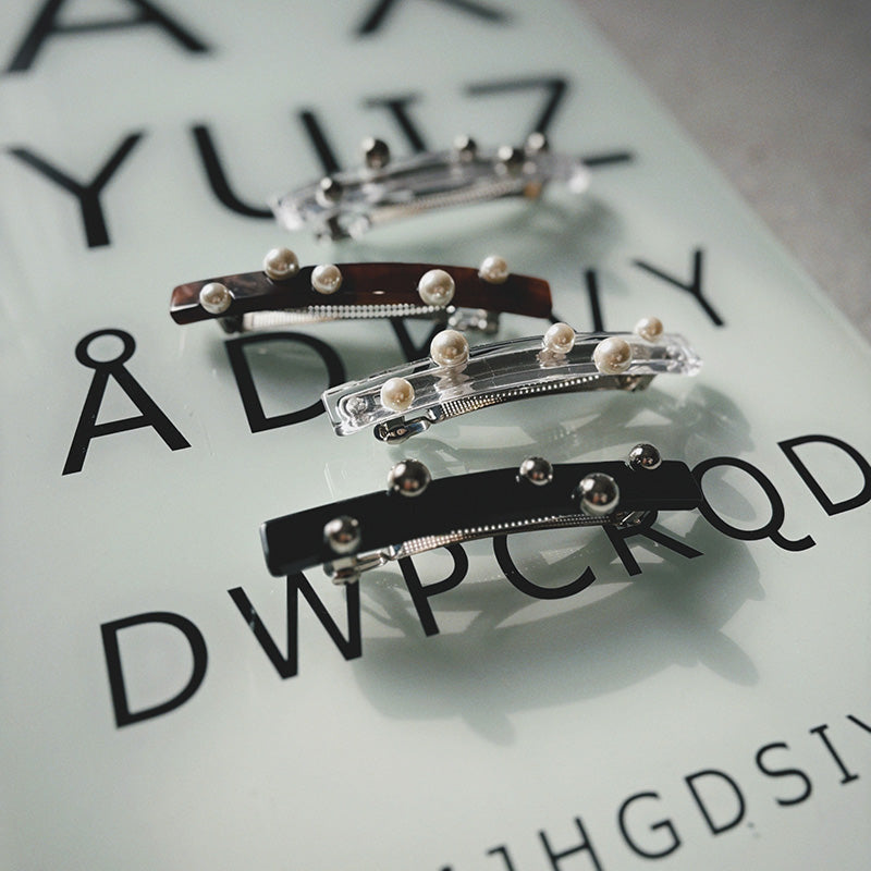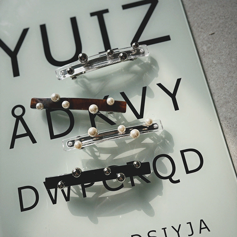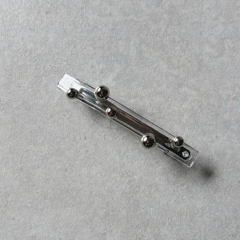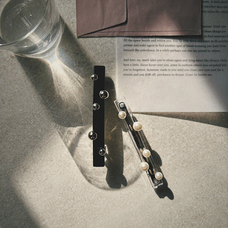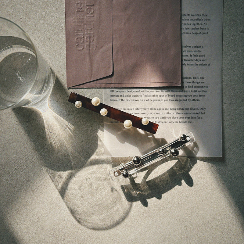 ポニーテールが一気に洗練される直線的なフォルムにランダムに配されたパールやメタルボール。